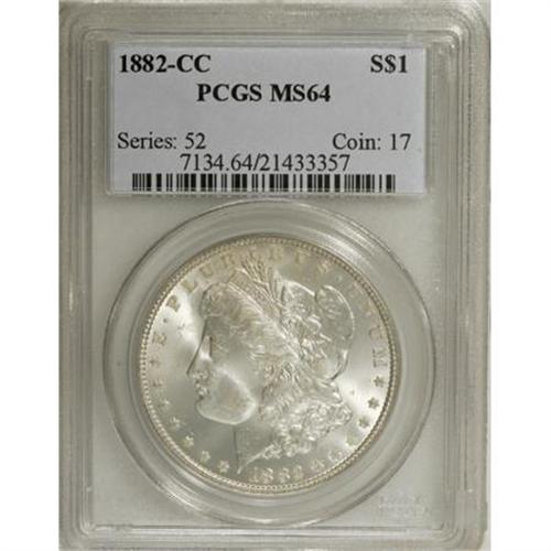 <B>1882-CC $1 MS64 PCGS.</B></I> PCGS Population (8115/5007). NGC Census: (3425/2657). Mintage: 1,133,000. Numismedia Wsl. Price for NGC/PCGS coin in MS64: $228. (#7134)<BR><BR><B>Coin Engraver:</B> George T. Morgan<BR><BR><b>Shipping:</b> Coins & Currency (<a target="_blank" href="http://www.heritageauctions.com/common/shipping.php">view shipping information</a>)