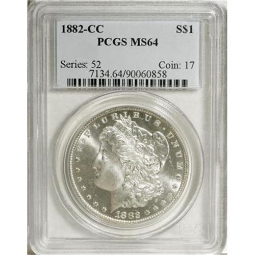 <B>1882-CC $1 MS64 PCGS.</B></I> PCGS Population (8161/5054). NGC Census: (3425/2657). Mintage: 1,133,000. Numismedia Wsl. Price for NGC/PCGS coin in MS64: $228. (#7134)<BR><BR><B>Coin Engraver:</B> George T. Morgan<BR><BR><b>Shipping:</b> Coins & Currency (<a target="_blank" href="http://www.heritageauctions.com/common/shipping.php">view shipping information</a>)
