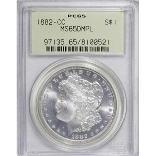 <B>1882-CC $1 MS65 Deep Mirror Prooflike PCGS.</B></I> Well struck with exceedingly frosty, fully bright surfaces that have glassy, dazzlingly reflective fields. Essentially untoned on the obverse, though the lower reverse shows a touch of tan. A beautiful older holder DMPL Gem.<BR><BR><b>Shipping:</b> Coins & Currency (<a target="_blank" href="http://www.heritageauctions.com/common/shipping.php">view shipping information</a>)