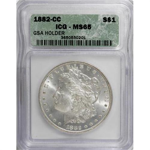 <B>1882-CC $1 MS65 ICG.</B></I> Ex:GSA. NGC Census: (2235/503). PCGS Population (4171/1012). Mintage: 1,133,000. Numismedia Wsl. Price for NGC/PCGS coin in MS65: $385. (#7134)<BR><BR><B>Coin Engraver:</B> George T. Morgan<BR><BR><b>Shipping:</b> Coins & Currency (<a target="_blank" href="http://www.heritageauctions.com/common/shipping.php">view shipping information</a>)