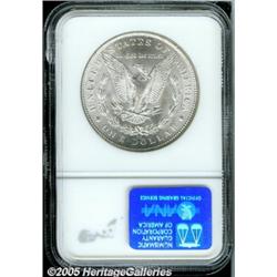 <B>1882-CC<img border='0' src='http://www.heritagecoins.com/images/star.gif' width=10 height=10>$1 MS65 NGC.</B></I> Smooth surfaces emit strong luster. The design features are well impressed, and just a couple of minor luster grazes are noted on Liberty's cheek.