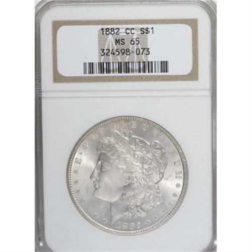 <B>1882-CC $1 MS65 NGC.</B></I> . NGC Census: (2232/494). PCGS Population (4139/1003). Mintage: 1,133,000. Numismedia Wsl. Price for NGC/PCGS coin in MS65: $392. (#7134)<BR><BR><B>Coin Engraver:</B> George T. Morgan<BR><BR><b>Shipping:</b> Coins & Currency (<a target="_blank" href="http://www.heritageauctions.com/common/shipping.php">view shipping information</a>)