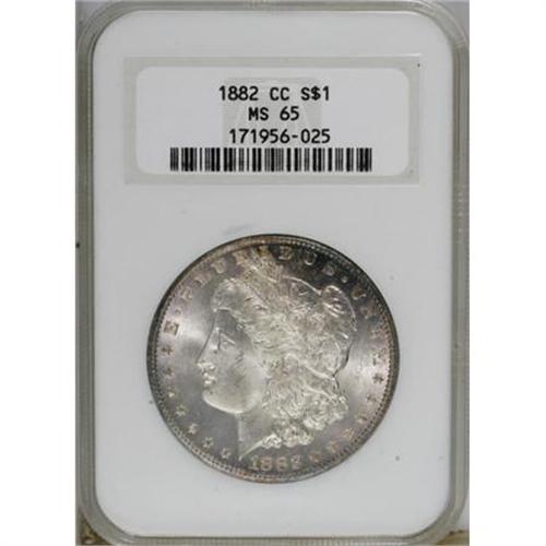 <B>1882-CC $1 MS65 NGC.</B></I> NGC Census: (2232/496). PCGS Population (4154/1007). Mintage: 1,133,000. Numismedia Wsl. Price for NGC/PCGS coin in MS65: $385. (#7134)<BR><BR><B>Coin Engraver:</B> George T. Morgan<BR><BR><b>Shipping:</b> Coins & Currency (<a target="_blank" href="http://www.heritageauctions.com/common/shipping.php">view shipping information</a>)