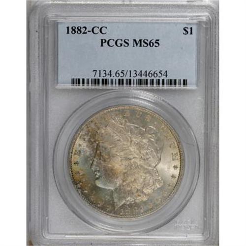 <B>1882-CC $1 MS65 PCGS.</B></I> PCGS Population (4047/960). NGC Census: (2179/478). Mintage: 1,133,000. Numismedia Wsl. Price for NGC/PCGS coin in MS65: $392. (#7134)<BR><BR><B>Coin Engraver:</B> George T. Morgan<BR><BR><b>Shipping:</b> Coins & Currency (<a target="_blank" href="http://www.heritageauctions.com/common/shipping.php">view shipping information</a>)