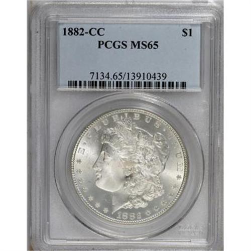 <B>1882-CC $1 MS65 PCGS.</B></I> PCGS Population (4074/980). NGC Census: (2179/478). Mintage: 1,133,000. Numismedia Wsl. Price for NGC/PCGS coin in MS65: $392. (#7134)<BR><BR><B>Coin Engraver:</B> George T. Morgan<BR><BR><b>Shipping:</b> Coins & Currency (<a target="_blank" href="http://www.heritageauctions.com/common/shipping.php">view shipping information</a>)