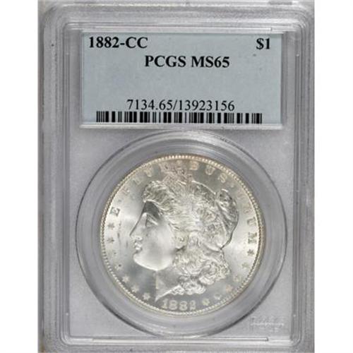 <B>1882-CC $1 MS65 PCGS.</B></I> PCGS Population (4102/990). NGC Census: (2216/482). Mintage: 1,133,000. Numismedia Wsl. Price for NGC/PCGS coin in MS65: $392. (#7134)<BR><BR><B>Coin Engraver:</B> George T. Morgan<BR><BR><b>Shipping:</b> Coins & Currency (<a target="_blank" href="http://www.heritageauctions.com/common/shipping.php">view shipping information</a>)