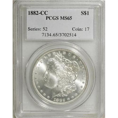 <B>1882-CC $1 MS65 PCGS.</B></I> . PCGS Population (4154/1007). NGC Census: (2232/496). Mintage: 1,133,000. Numismedia Wsl. Price for NGC/PCGS coin in MS65: $385. (#7134)<BR><BR><B>Coin Engraver:</B> George T. Morgan<BR><BR><b>Shipping:</b> Coins & Currency (<a target="_blank" href="http://www.heritageauctions.com/common/shipping.php">view shipping information</a>)