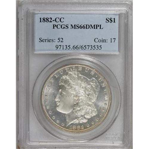 <B>1882-CC $1 MS66 Deep Mirror Prooflike PCGS.</B></I> Deeply mirrored fields highlight the lightly frosted motifs on this lovely Premium Gem. A sharp strike emboldens the design elements, and just a hint of light gold color gravitates to the obverse periphery. A few minor obverse luster grazes do not disturb. Population: 59 in 66 Deep Mirror Prooflike, 1 finer (8/07).<BR><BR><b>Shipping:</b> Coins & Currency (<a target="_blank" href="http://www.heritageauctions.com/common/shipping.php">view shipping information</a>)