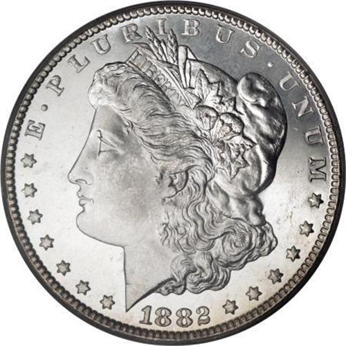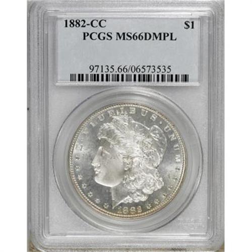 <B>1882-CC $1 MS66 Deep Mirror Prooflike PCGS.</B></I> This is a wonderful Premium Gem whose frosted motifs yield strong contrast with the deeply mirrored fields. Nearly untoned, except for a wisp of gold color along the lower obverse border. A penetrating strike delineates the design elements, including the hair at Liberty's ear and the eagle's breast feathers. A few minor obverse luster grazes are noted. Population: 59 in 66 Deep Mirror Prooflike, 1 finer (12/07).<BR><BR><b>Shipping:</b> Coins & Currency (<a target="_blank" href="http://www.heritageauctions.com/common/shipping.php">view shipping information</a>)
