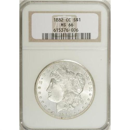 <B>1882-CC $1 MS66 NGC.</B></I> Solidly struck with vibrant luster and a few small areas of milky haze in the fields. This attractive Premium Gem, from an issue that made up a significant proportion of the GSA dollars, has a few dots of deep crimson patina, two near the date and one on the tip of the eagle's right (facing) wing.<BR><I>From The Silver Fox Collection.</B></I><BR><BR><b>Shipping:</b> Coins & Currency (<a target="_blank" href="http://www.heritageauctions.com/common/shipping.php">view shipping information</a>)
