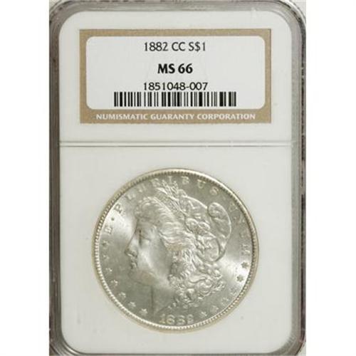 <B>1882-CC $1 MS66 NGC.</B></I> Well struck with vibrant luster and a touch of tan at the rims. The carefully preserved surfaces exhibit a modicum of haze. An appealing, high-grade representative of this earlier CC-mint Morgan dollar issue.<BR><BR><B>Coin Engraver:</B> George T. Morgan<BR><BR><b>Shipping:</b> Coins & Currency (<a target="_blank" href="http://www.heritageauctions.com/common/shipping.php">view shipping information</a>)