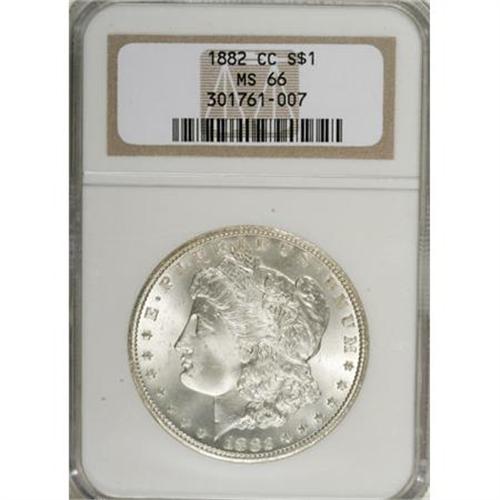 <B>1882-CC $1 MS66 NGC.</B></I> This is a blindingly brilliant Premium Gem with lovely mint frost over both sides. The design elements are well struck and the surfaces are very clean, as expected for the grade. A readily available issue that is ideal for Carson City type collectors. <BR><I>From The Arnold & Harriet Collection, Part Two.</B></I><BR><BR><B>Coin Engraver:</B> George T. Morgan<BR><BR><b>Shipping:</b> Coins & Currency (<a target="_blank" href="http://www.heritageauctions.com/common/shipping.php">view shipping information</a>)