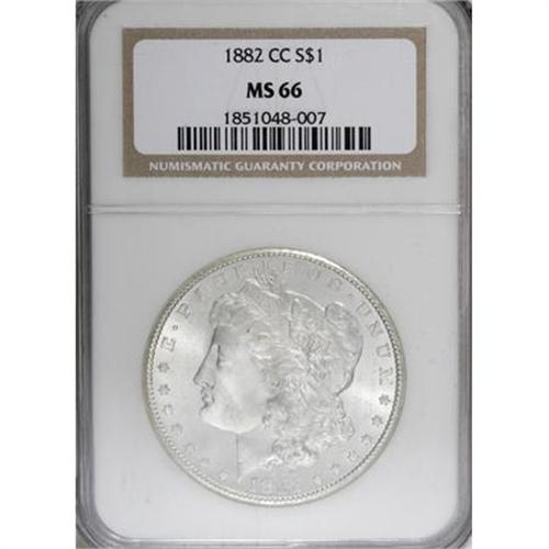 <B>1882-CC $1 MS66 NGC.</B></I> Untoned and snow-white with intense mint luster across both sides. Slight weakness is noted just above Liberty's ear, and on the eagle's breast feathers. Both sides are well preserved and minimally marked; Liberty's cheek is especially clean. <BR><BR><B>Coin Engraver:</B> George T. Morgan<BR><BR><b>Shipping:</b> Coins & Currency (<a target="_blank" href="http://www.heritageauctions.com/common/shipping.php">view shipping information</a>)