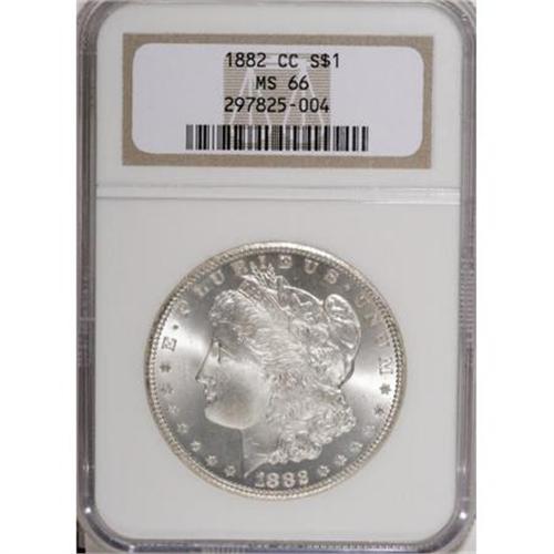 <B>1882-CC $1 MS66 NGC.</B></I> Lovely cartwheel luster radiates from the snowy-white surfaces of this well produced coin. The strike is bold, and the overall eye appeal is high. <BR><I>From The Oxford Collection.</B></I><BR><BR><B>Coin Engraver:</B> George T. Morgan<BR><BR><b>Shipping:</b> Coins & Currency (<a target="_blank" href="http://www.heritageauctions.com/common/shipping.php">view shipping information</a>)