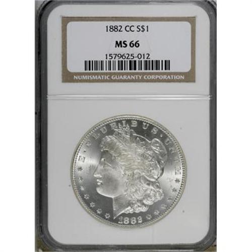 <B>1882-CC $1 MS66 NGC.</B></I> An essentially untoned example of this popular Carson City issue, sharply struck with vibrantly lustrous fields and richly frosted devices. NGC has graded only 43 numerically finer pieces (2/08).<BR><BR><B>Coin Engraver:</B> George T. Morgan<BR><BR><b>Shipping:</b> Coins & Currency (<a target="_blank" href="http://www.heritageauctions.com/common/shipping.php">view shipping information</a>)