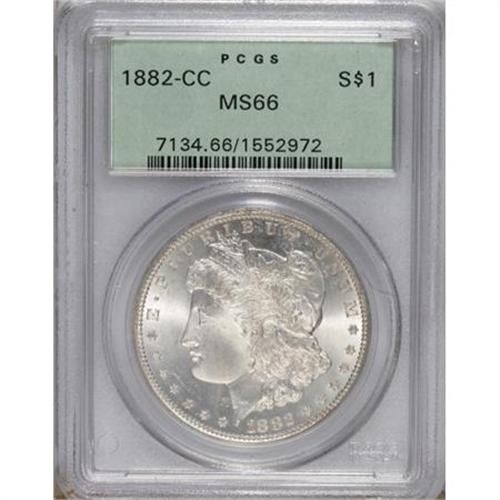 <B>1882-CC $1 MS66 PCGS.</B></I> Well struck with snow-white surfaces that exhibit intense mint frost and dazzling cartwheel splendor over both sides. Liberty's cheek is clean and the eagle's breast is pristine. A minimally marked, beautifully preserved Carson City dollar. <BR><BR><b>Shipping:</b> Coins & Currency (<a target="_blank" href="http://www.heritageauctions.com/common/shipping.php">view shipping information</a>)
