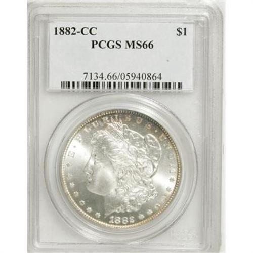 <B>1882-CC $1 MS66 PCGS.</B></I> Crisply struck with above-average luster, even for this popular Carson City issue that is known to "come nice". The obverse is untoned save for a hint of violet at the upper margins, while the reverse displays delicate gold-orange peripheral toning.<BR><BR><B>Coin Engraver:</B> George T. Morgan<BR><BR><b>Shipping:</b> Coins & Currency (<a target="_blank" href="http://www.heritageauctions.com/common/shipping.php">view shipping information</a>)
