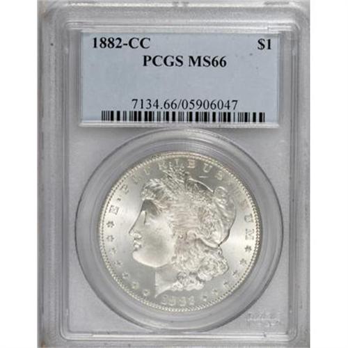 <B>1882-CC $1 MS66 PCGS.</B></I> Boldly impressed with just a touch of patina on the portrait, an exquisitely preserved Carson City representative with vibrant luster and excellent eye appeal. PCGS has graded 49 finer pieces (10/07).<BR><BR><B>Coin Engraver:</B> George T. Morgan<BR><BR><b>Shipping:</b> Coins & Currency (<a target="_blank" href="http://www.heritageauctions.com/common/shipping.php">view shipping information</a>)