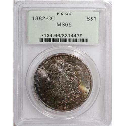 <B>1882-CC $1 MS66 PCGS.</B></I> A medley of multicolored patina bathes the obverse, while the reverse is essentially untoned. Radiantly lustrous surfaces display sharply struck design elements, and are well preserved. Housed in a green label holder.<BR><BR><B>Coin Engraver:</B> George T. Morgan<BR><BR><b>Shipping:</b> Coins & Currency (<a target="_blank" href="http://www.heritageauctions.com/common/shipping.php">view shipping information</a>)