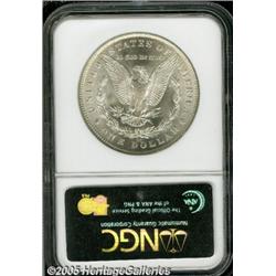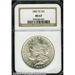 <B>1882-CC<img border='0' src='http://www.heritagecoins.com/images/star.gif' width=10 height=10>$1 MS67 NGC.</B></I> Because of the extensive holdings of the 1882-CC by the GSA, this issue is usually (and correctly) considered to be a common CC type coin. However, in MS67 condition it is anything but common. Only 23 pieces have been so graded by NGC with one finer at both services (2/05). This is a splendid example that has snow-white mint frost and a full strike. Minimally abraded with only the slightest luster grazes present.