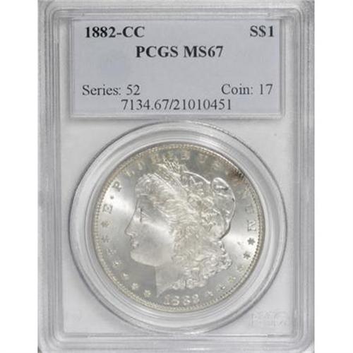 <B>1882-CC $1 MS67 PCGS.</B></I> Light golden patina graces this thoroughly lustrous and alertly struck Superb Gem. A dab of slightly deeper obverse toning is noted at 2 o'clock. The 1882-CC is plentiful in typical Mint State, but surprisingly few pieces can aspire to the MS67 level. Population: 47 in 67, 1 finer (7/07).<BR><I>From The #3 PCGS 'Mile High' Registry Set of Carson City Morgan Dollars.</B></I><BR><BR><B>Coin Engraver:</B> George T. Morgan<BR><BR><b>Shipping:</b> Coins & Currency (<a target="_blank" href="http://www.heritageauctions.com/common/shipping.php">view shipping information</a>)
