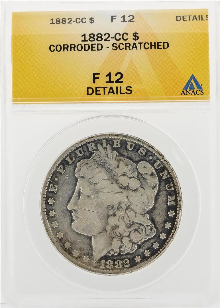 One 1882-CC $1 Morgan Silver Dollar Coin Corroded Scratched ANACS F12 Details. ANACS Certified.