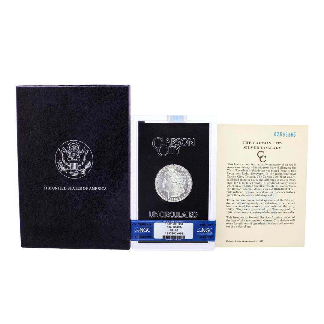 One 1882-CC $1 Morgan Silver Dollar Coin GSA Hoard Uncirculated NGC MS63 w/Box & COA. NGC Certified.