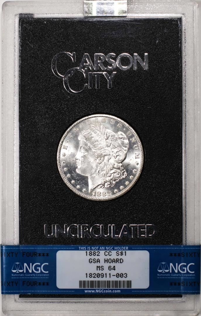 One 1882-CC $1 Morgan Silver Dollar Coin GSA Hoard Uncirculated NGC MS64 w/ Box. NGC Certified.