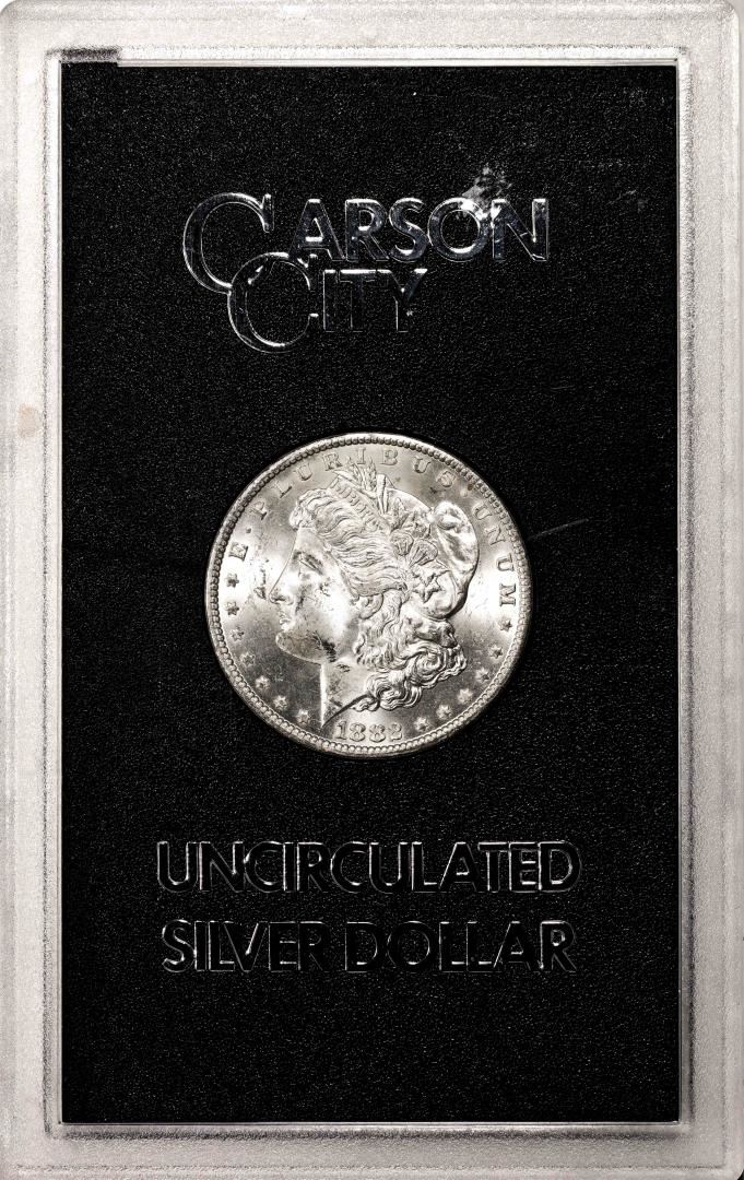 One 1882-CC $1 Morgan Silver Dollar Coin GSA Hoard Uncirculated.
