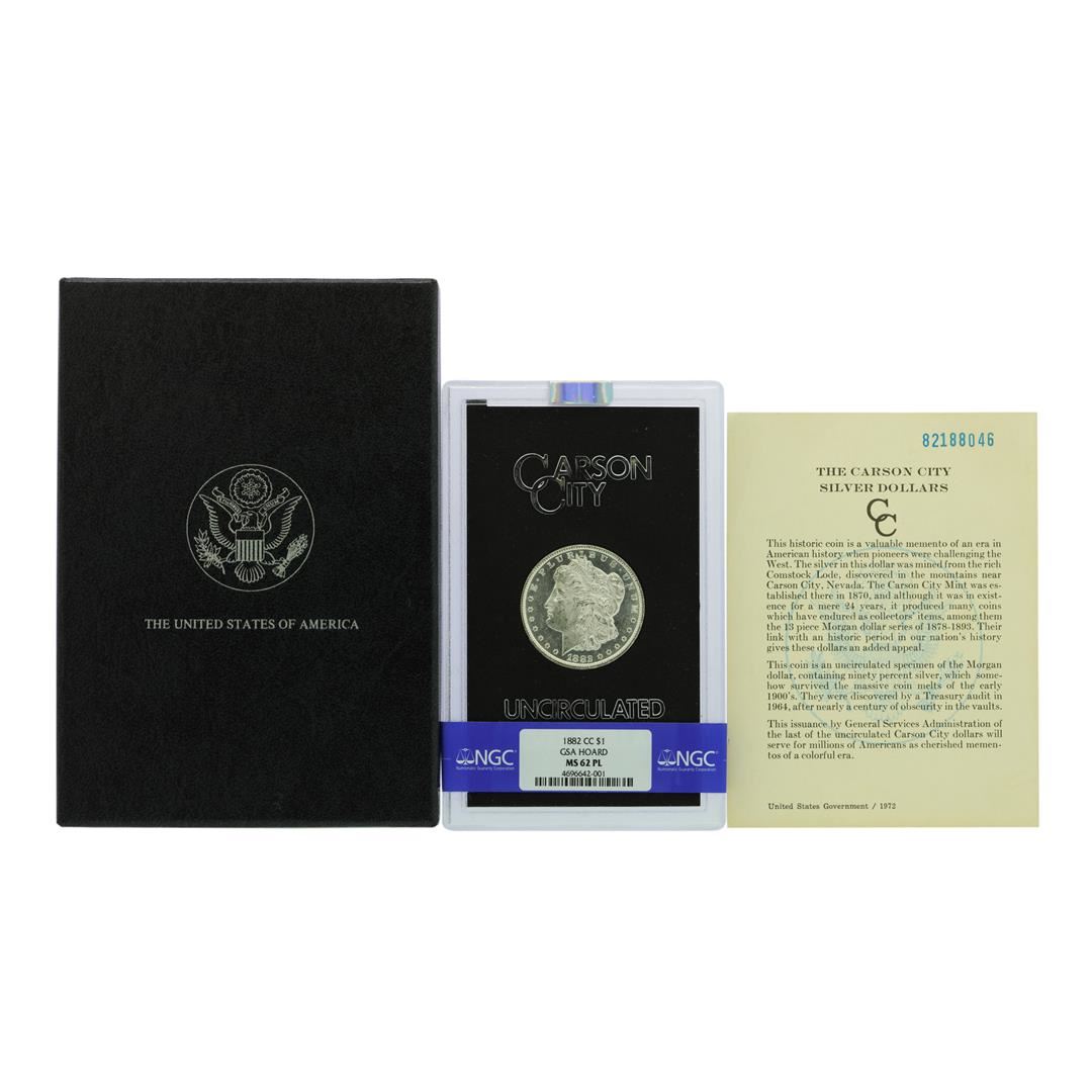 One 1882-CC $1 Morgan Silver Dollar Coin GSA NGC MS62PL w/ Box & COA. NGC Certified.