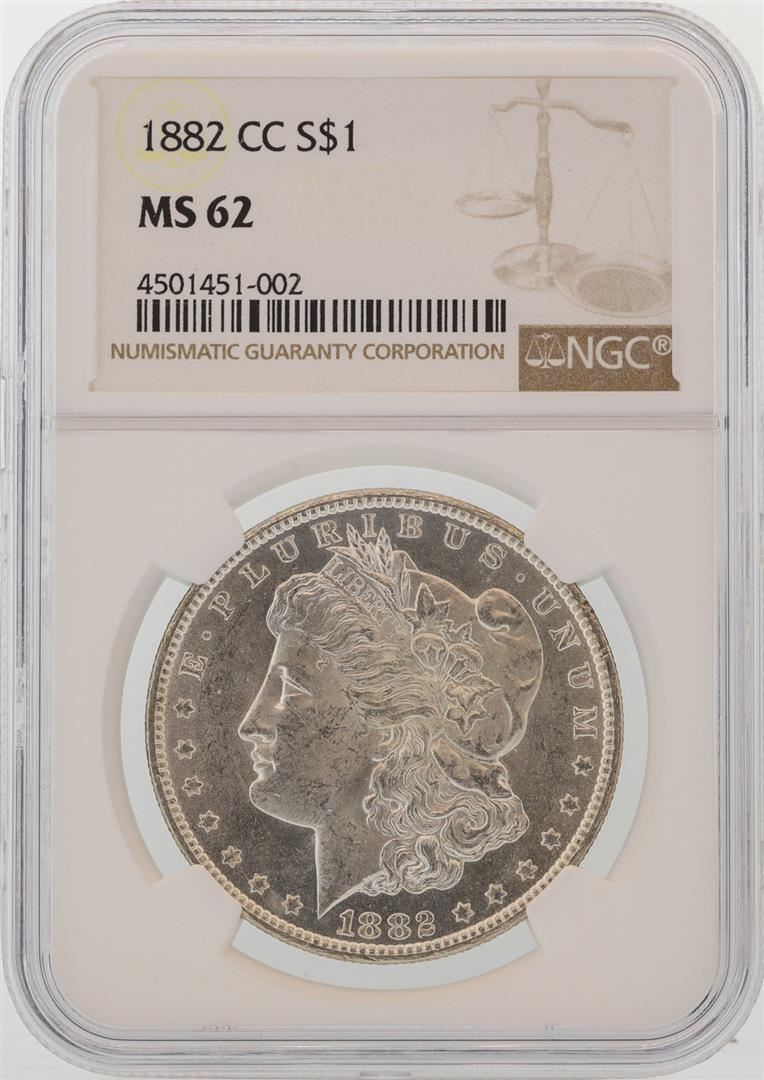 One 1882-CC $1 Morgan Silver Dollar Coin NGC MS62. NGC Certified.