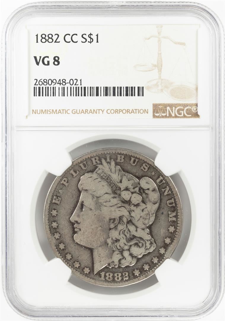 One 1882-CC $1 Morgan Silver Dollar Coin NGC VG8. NGC Certified.