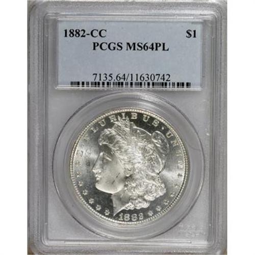 <B>1882-CC $1 MS64 Prooflike PCGS.</B></I> PCGS Population (695/376). NGC Census: (371/186). Numismedia Wsl. Price for NGC/PCGS coin in MS64: $244. (#7135)<BR><BR><B>Coin Engraver:</B> George T. Morgan<BR><BR><b>Shipping:</b> Coins & Currency (<a target="_blank" href="http://www.heritageauctions.com/common/shipping.php">view shipping information</a>\)
