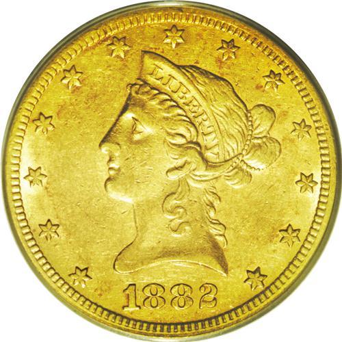 <B>1882-CC<$10> AU53 PCGS.</B></I> Variety 2-A. The misplaced digits in the denticles are quite prominent on this piece. Well struck, the surfaces show a warm golden-orange coloration with bright remnants of luster surrounding the devices. A minimally abraded example and quite scarce as such.