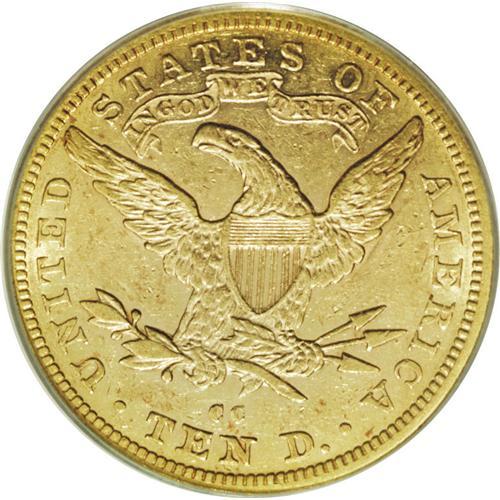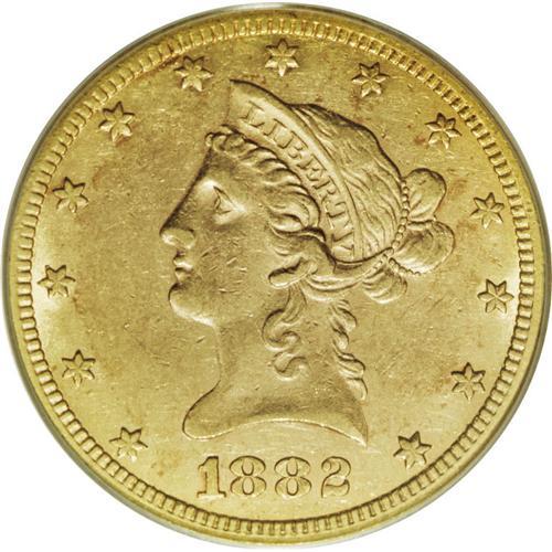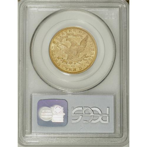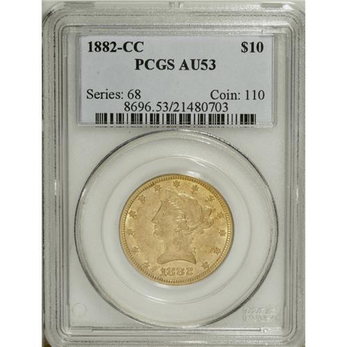 <B>1882-CC $10 AU53 PCGS.</B></I> Variety 2-A. Two lunules of the top of the two 8s in the date were mispunched in the dentils below the date, and the misplaced digits are quite prominent on this piece. Well struck, the surfaces show a warm golden-orange coloration with bright remnants of luster surrounding the devices. A minimally abraded example and quite scarce as such.<BR><BR><b>Shipping:</b> Coin/Currency (<a target="_blank" href="http://www.heritageauctions.com/common/shipping.php">view shipping information</a>)