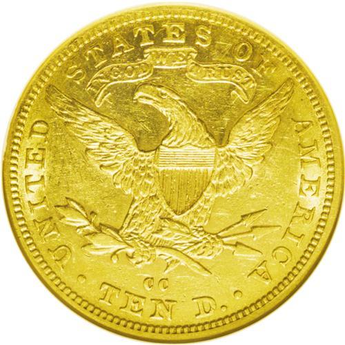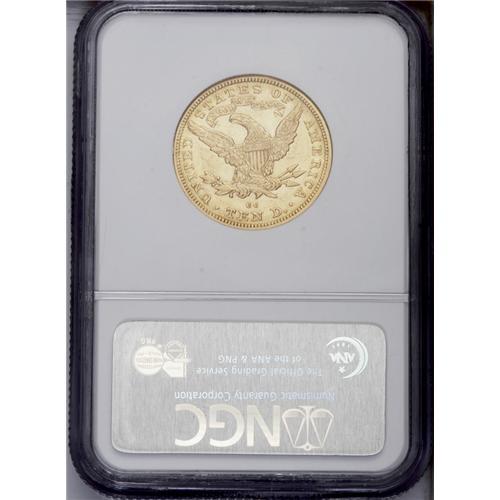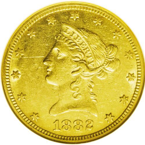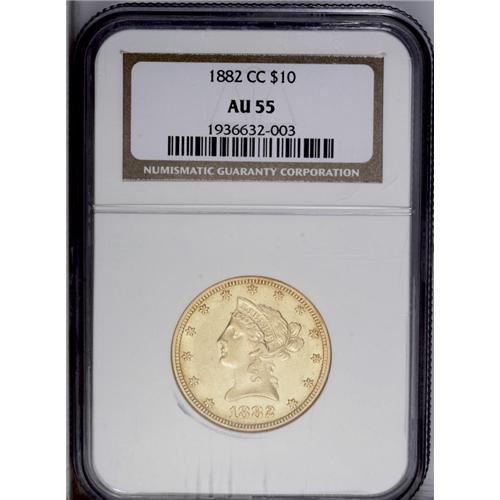 <B>1882-CC<$10> AU55 NGC.</B></I> The borders have pleasing luster, and the devices have only light rub. The reverse field has a few trivial abrasions. A difficult low mintage Carson City issue that is more typically encountered in VF and XF grades. Just 6,764 pieces were struck.