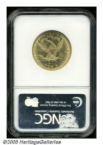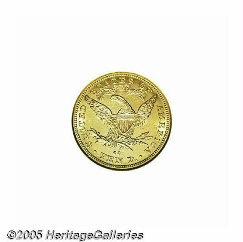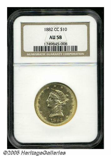 <B>1882-CC<$10> AU58 NGC.</B></I> This impressive Borderline Uncirculated Carson City Eagle possesses a penetrating strike and has vivacious mint luster throughout the borders and devices. A few faint slide marks are noted beneath the left (facing) wing, but the surfaces are generally very clean for the grade and denomination. Just 6,764 pieces were struck, and high grade survivors with the eye appeal of the present piece are very rare. As of (6/05), NGC has certified only one example finer.