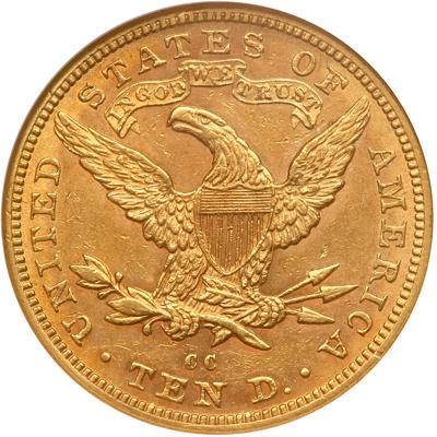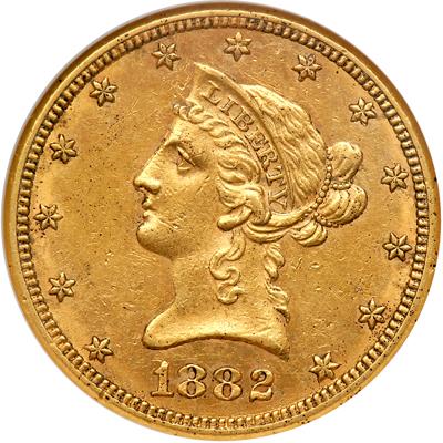 1882-CC $10 Liberty. NGC graded AU-58. Only 6,764 pieces struck. Toned on both sides. Reflective surfaces. A scarce date Carson City mint issue, for years these would rarely show in auctions, even well-circulated pieces are few and far between. Although the 1882-CC doesn't have the same cache as, say, 1870-CC, it still takes a lot of searching to find one as crisply detailed, as lustrous, as the present AU58 specimen. There is no substitute for quality! Pop 35; 3 finer, 2 in 61, 1 in 62 (PCGS # 8696).