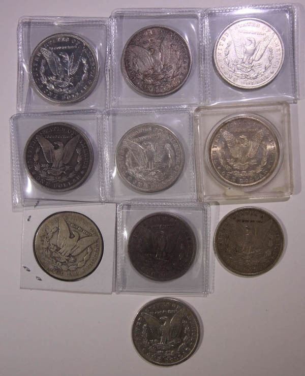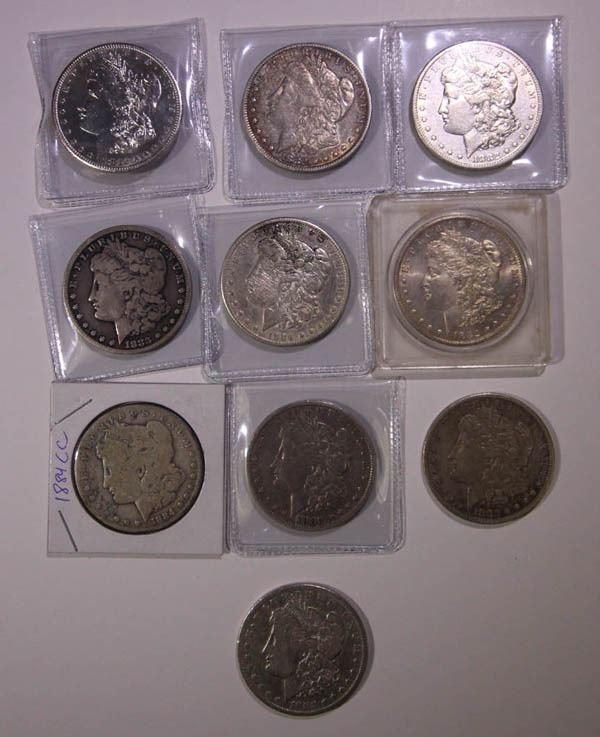 1882-CC/1884-CC Morgan Dollars, Carson City. About Good to About Uncirculated. Ten pieces: 1882-CC 6; 1883-CC 2; 1884-cc 2. One of the 1884-CC coins with serious obverse scratches.