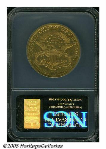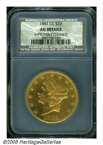 <B>1882-CC<$20> AU Details, Improperly Cleaned, NCS.</B></I> A polished and unnaturally prooflike example of this always popular Carson City issue. Liberty's cheek and hair exhibit wear appropriate for the AU details designation.