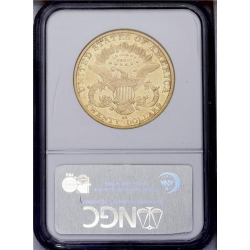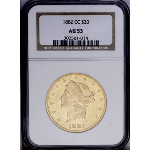<B>1882-CC $20 AU53 NGC.</B></I> A minimum number of marks and abrasions are seen, with an abundant complement of luster. The low mintage 1882-CC (39,140 pieces) is a median rarity among Carson City twenties and becomes decidedly more difficult in grades approaching Mint State.
