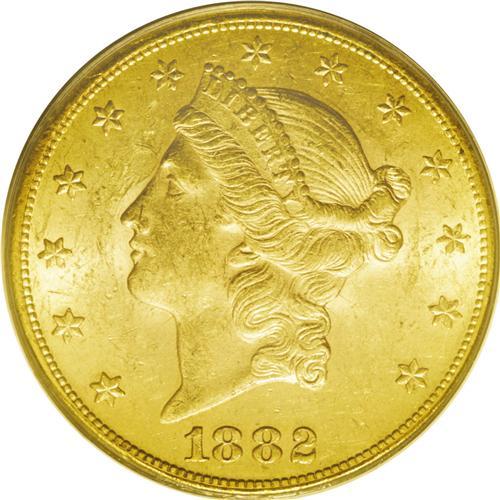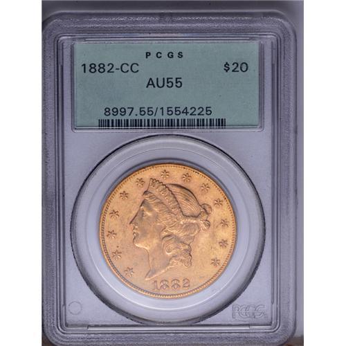 1882-CC $20 AU55 PCGS. In 1880 and 1881, the primary d
