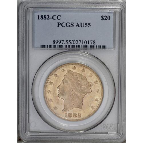 <B>1882-CC $20 AU55 PCGS.</B></I> The obverse's peripheral luster remains strong, and the reverse is hardly affected by wear. Well struck with light wear and the usual marks on the devices.<BR><BR><b>Shipping:</b> Coin/Currency (<a target="_blank" href="http://www.heritageauctions.com/common/shipping.php">view shipping information</a>)