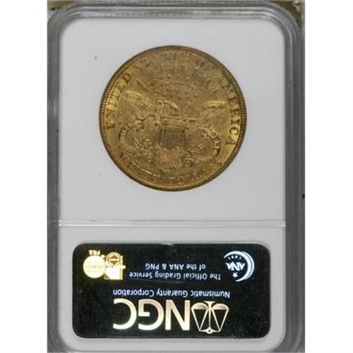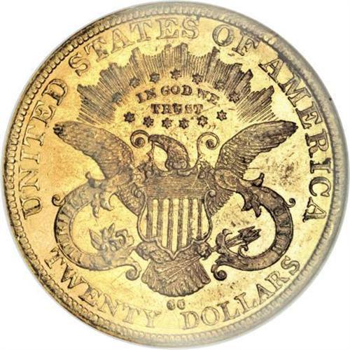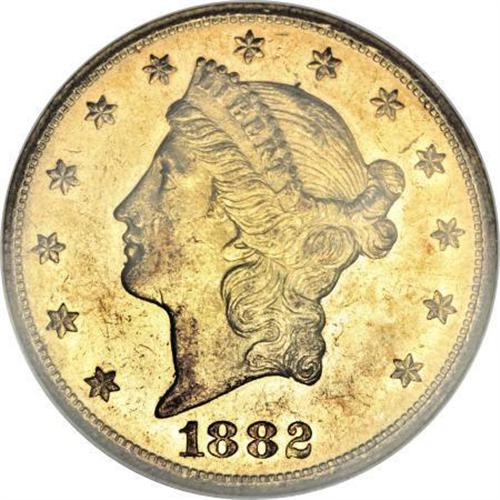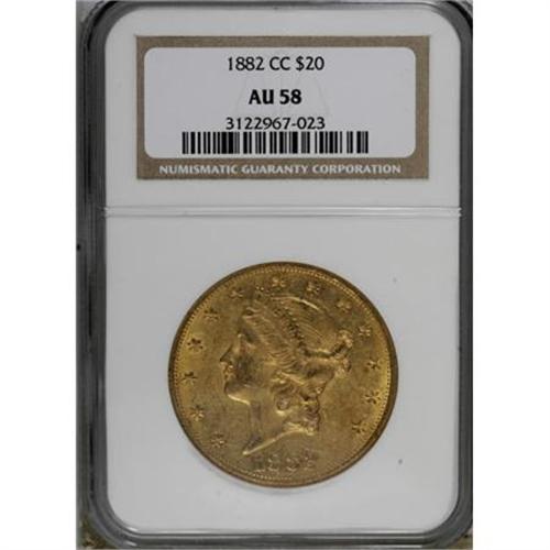 <B>1882-CC $20 AU58 NGC.</B></I> This near-Mint example displays semi-prooflike fields when the coin is tilted ever so slightly under a light source. Yellow-gold patina displays hints of light green and tan, and a well executed strike results in good definition on the design elements. <BR><BR><B>Coin Engraver:</B> James B. Longacre<BR><BR><b>Shipping:</b> Coins & Currency (<a target="_blank" href="http://www.heritageauctions.com/common/shipping.php">view shipping information</a>)