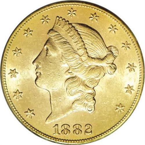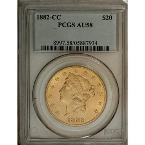<B>1882-CC $20 AU58 PCGS.</B></I> A penetrating strike brings out sharp definition on the design elements of this high-end AU Carson City example. Honey-gold surfaces exhibit considerable luster, and are minimally abraded. A large number of this issue were used in international trade, and returning specimens are in the VF to AU range. Population: 80 in 58, 52 finer (12/07).<BR><BR><B>Coin Engraver:</B> James B. Longacre<BR><BR><b>Shipping:</b> Coins & Currency (<a target="_blank" href="http://www.heritageauctions.com/common/shipping.php">view shipping information</a>)
