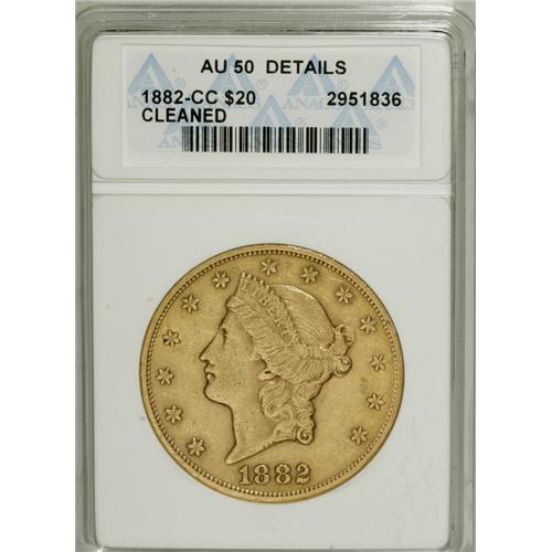 <B>1882-CC $20 --Cleaned--ANACS. AU50 Details.</B></I> Scattered tiny ticks and a somewhat subdued appearance suggest a past stint as jewelry, although there are no offensive marks or hairlines, and the rims are unimpaired. Significant luster remains despite slight highpoint wear.<BR><BR><b>Shipping:</b> Coins & Currency (<a target="_blank" href="http://www.heritageauctions.com/common/shipping.php">view shipping information</a>)