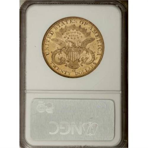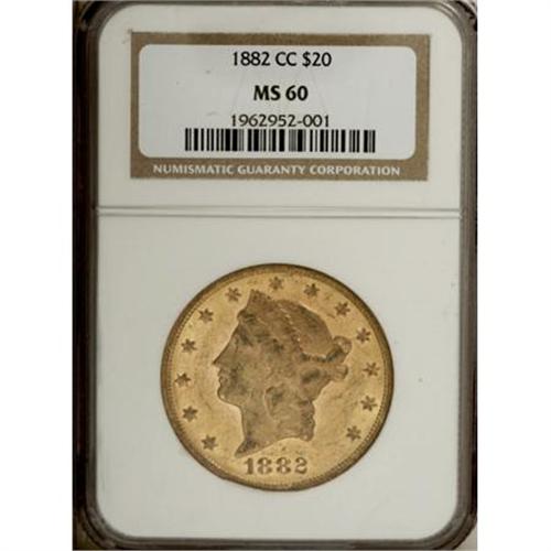 <B>1882-CC $20 MS60 NGC.</B></I> The 1882-CC double eagle is available in most grades from Very Fine to About Uncirculated, and what few Mint State coins are available occur mainly in MS60 to MS62; finer pieces are virtually unknown. This MS60 specimen displays peach-gold surfaces with semi-prooflike fields, and a sharp strike delineates the design features. Both sides display moderate bagmarks, but these distractions are offset to a certain extent by the coin's pronounced prooflikeness, and the net result is a very decent level of overall eye appeal, for the grade. Census: 20 in 60, 24 finer (11/07).<BR><I>From The New York Eye Appeal Collection, Part Three.</B></I><BR><BR><B>Coin Engraver:</B> James B. Longacre<BR><BR><b>Shipping:</b> Coins & Currency (<a target="_blank" href="http://www.heritageauctions.com/common/shipping.php">view shipping information</a>)