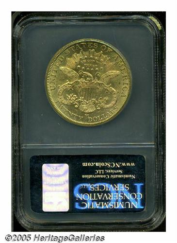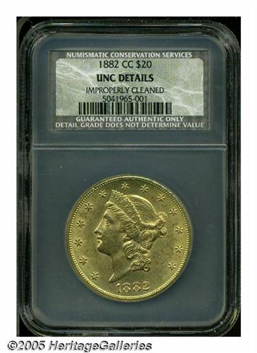 <B>1882-CC<$20> Unc Details, Improperly Cleaned, NCS.</B></I> Wispy hairlines cross both sides of this lustrous and nicely struck Carson City Double Eagle. The 1882-CC is rare in Mint State, and this lustrous and relatively unbagmarked piece might have made the Condition Census had it not been cleaned.