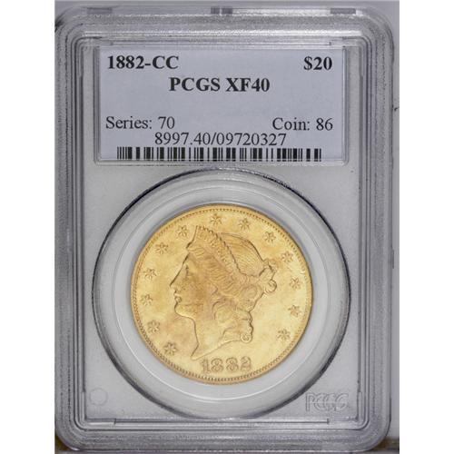 <B>1882-CC<$20> XF40 PCGS.</B></I> Bright peach-red and green-gold coloration covers both sides. Well detailed and lightly worn with a few minor abrasions and faint hairlines on obverse and reverse alike.<BR><I>From The Steve Glenn Collection.</B></I> <BR><BR><B>Important notice:</B> Heritage usually auctions material at the rate of 200-250 lots per hour. On some occasions eBay Live bid software or the Internet may not be able to keep up with the pace of the auction. We recommend placing a realistic absentee bid now as insurance to avoid disappointment. Occasionally the auctioneer may eliminate or reject an eBay Live bid, and the auctioneer may also reopen a lot after the close of the eBay live bidding (usually because we missed an audience bid), and may reject your bid even if it shows you as the winning bidder. By bidding via eBay Live, you agree that Heritage may award the lot to another bidder at its sole discretion under the circumstances described above or any other reasonable circumstances. Since eBay bids are not shown to us until we open the lot on the floor, we treat those bids just like floor bids. In most cases the floor responds before the eBay bid is presented to us, due to Internet lag time, so for consistency we have made it a policy that floor bids are always considered first over tie eBay live bids. Also please note that all Heritage lots purchased through eBay Live carry a 20% Buyer's Premium. Please make sure you read the Terms and Conditions before you bid. This lot is being auctioned in conjunction with a live floor auction by Heritage Galleries & Auctioneers. All final auction and invoice information will be supplied by Heritage Galleries & Auctioneers, and all other information should be considered preliminary. Lot:4285 <BR><BR><B>Winning Notification and Billing:</B> After the FINAL session in this auction is complete, Heritage will send e-mail and snail mail invoices. This process normally takes several days. All final auction and invoice information will be supplied by Heritage Galleries & Auctioneers, and all other information should be considered preliminary. <BR><BR>This auction will be conducted on a live auction floor and over the Internet through eBay Live. If you choose to place an absentee bid, please take a moment to <font color='#0000ff'><u><a href='http://pages.ebay.com/liveauctions/help/before/laabsentee.html'>learn how eBay Live absentee bidding works</a></u></font><font color='#000000'>