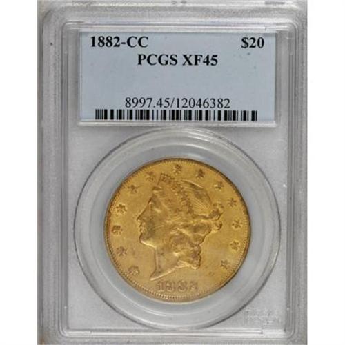 <B>1882-CC $20 XF45 PCGS.</B></I> A luminous orange-gold example with a touch of mint-green at the left reverse. Well-defined for the issue and the grade assigned, though Liberty's cheek shows a significant abrasion. Still, a pleasing piece.<BR><BR><B>Coin Engraver:</B> James B. Longacre<BR><BR><b>Shipping:</b> Coins & Currency (<a target="_blank" href="http://www.heritageauctions.com/common/shipping.php">view shipping information</a>)